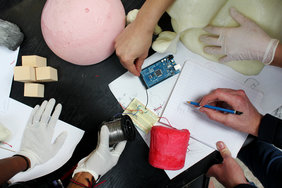 Polypeau propose une expérience sensorielle autour de la mousse polymère à peau. Rendues fonctionnelles, ces peaux sont capables de capter des informations en fonction de l'approche du visiteur. Leurs formes et textures traduisent des interactions différentes. Ainsi transformées en contrôleurs, elles prennent une nouvelle dimension.
