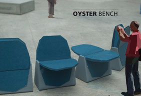 Oyster bench prend place dans l'espace public. C'est un banc à comportement, il réagit au passage des piétons. Il est composé d'un socle en béton sur lequel sont greffés deux abattants. En l'absence de sollicitation, ceux-ci sont relevés et oscillent comme pour signifier leur impatience. Dans cette position, ils ressemblent à des huîtres sur leur rocher.